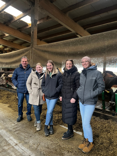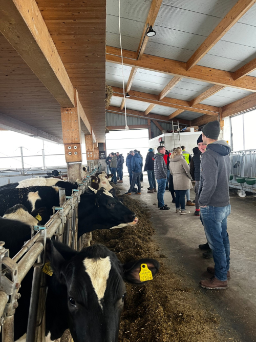 Der erste Betrieb des Tages war der Milchhof Nadlinger. Der Betrieb beeindruckte mit einem Stall für rund 80 Milchkühe, einem Kälberstall sowie einem eigenständigen Melkhaus. Besonders hervorzuheben sind die leistungsstarken Holsteinkühe. Durch die Zusammenarbeit mit Semex sowie die bereits seit rund 30 Jahren bestehende Direktvermarktung konnten die Teilnehmer viele interessante Einblicke in die Betriebsführung gewinnen. Auch der Tierschutzpreis 2025 unterstreicht die hohe Qualität der Tierhaltung am Betrieb.